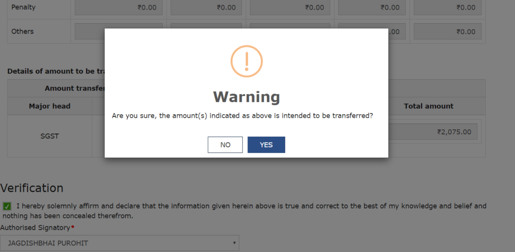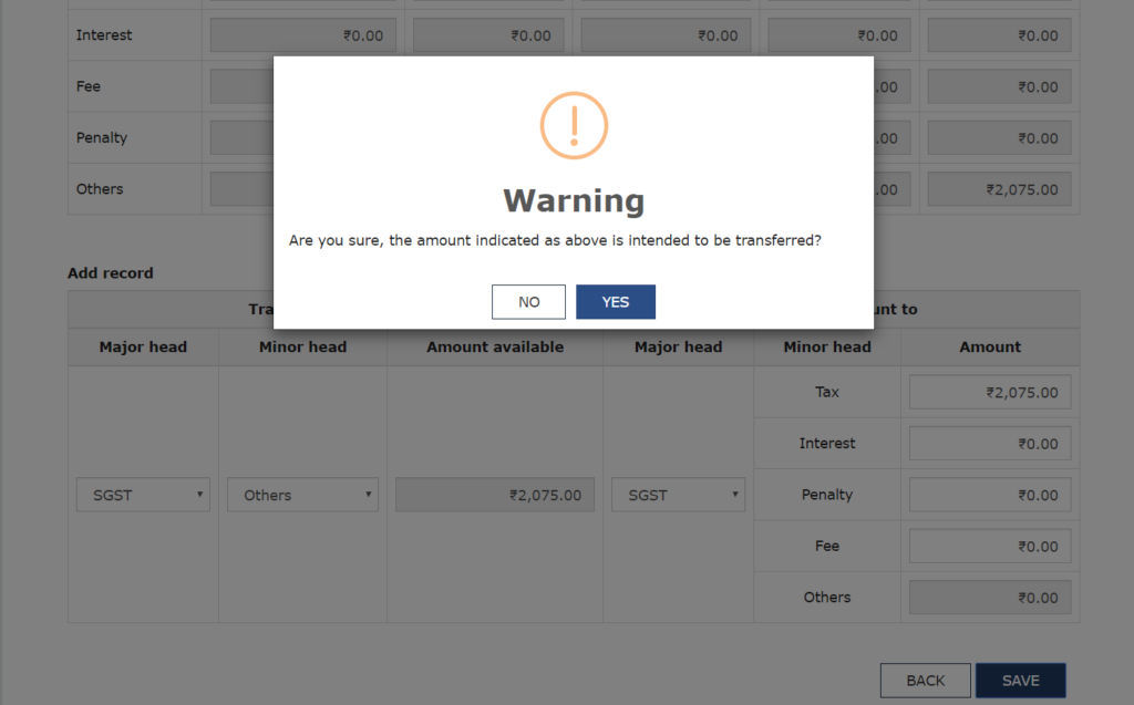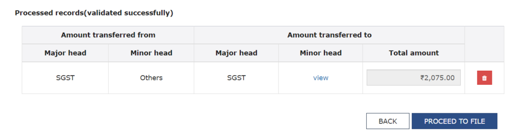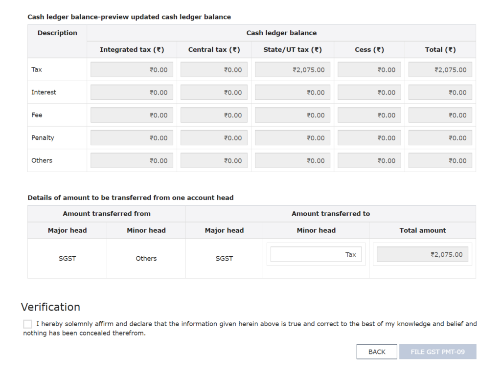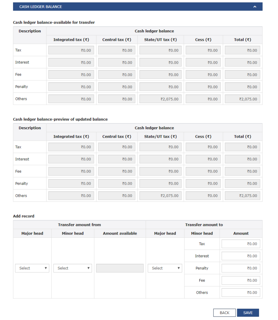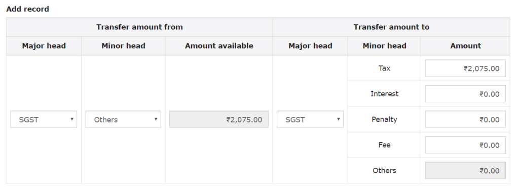 My electronic cash ledger balance is Rs. 2075 (under SGST) under others head and I need to transfer the SGST amount in same major head i.e. SGST but within another minor head i.e. tax. Let’s see with the help of a screenshot: